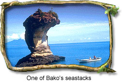 The Bako National Park covers 2,742 hectares of a rugged sand stone peninsula to the east of the Bako River near Kuching, the capital of Sarawak. Millions of years of erosion have created a coastline of steep cliffs, rocky headlands and stretches of white, sandy bays. Wave erosion at the base of the cliffs has carved many of the rocks into fantastically shaped sea arches and seastacks. Coloured patterns formed by iron deposition have also dominated the rocky headlands.
